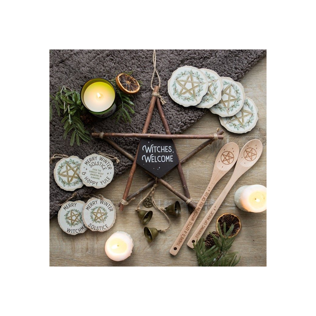 Let other like-minded souls know they're welcome with this rustic wooden pentagram hanging sign with the wording 'Witches Welcome'. Featuring tinkling bells, this piece is perfect for decorating a porch or entryway where visitors can admire its welcoming charm.