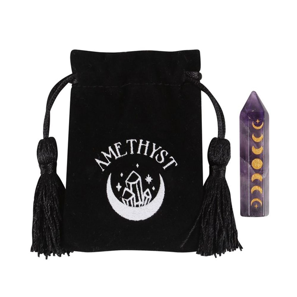 This beautiful amethyst crystal point is perfect in size for travel altars, desk decor or taking on the go for extra protection. Features a gold-tone moon phase engraving and comes with a matching drawstring bag for storage and safe-keeping. Product Dimensions: H5cm x W1.2cm x D1.1cm Packaged Dimensions: H8cm x W5.5cm x D1.4cm