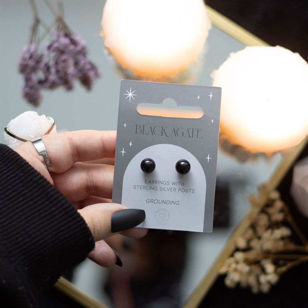 This pair of black agate crystal stud earrings comes on a matching backing card and makes a meaningful gift for those in need of spiritual protection. Black agate is a powerful semi-precious stone believed to create harmony and calm dark forces, making it ideal for grounding on protection. Finished with sterling silver posts with butterfly backs.