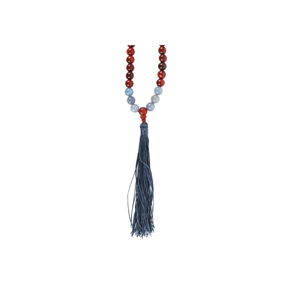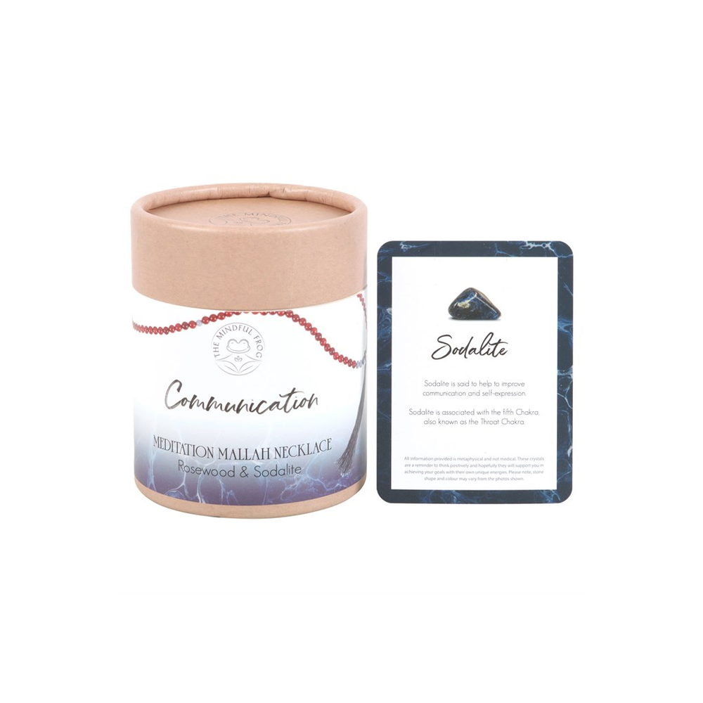 Crafted from rich, warm rosewood beads and interlaced with vibrant Sodalite stones, this elegant necklace features 108 beads — a traditional number in Mallah necklaces, symbolizing spiritual journey and mindfulness — and is finished with a decorative tassel. The Sodalite, renowned for its connection to communication and truth, is associated with the throat chakra. It is believed to enhance clear thinking, verbal expression, and emotional balance, encouraging the wearer to speak their truth with clarity and confidence. A Mallah, or Mala, necklace is a string of beads traditionally used in meditation and prayer in various spiritual practices including Buddhism and Hinduism. Each bead represents a repetition of a mantra or prayer, aiding in focus and spiritual contemplation. To use simply hold the necklace in one hand and move from bead to bead whilst focusing on mindful breathing and repeating an intention. The necklace can be worn throughout the day as a reminder of these intentions. Each Mallah Necklace is presented in a beautifully designed box, accompanied by a corresponding information card, making it an ideal and thoughtful gift for a loved one who values clear communication, truth, and emotional harmony.