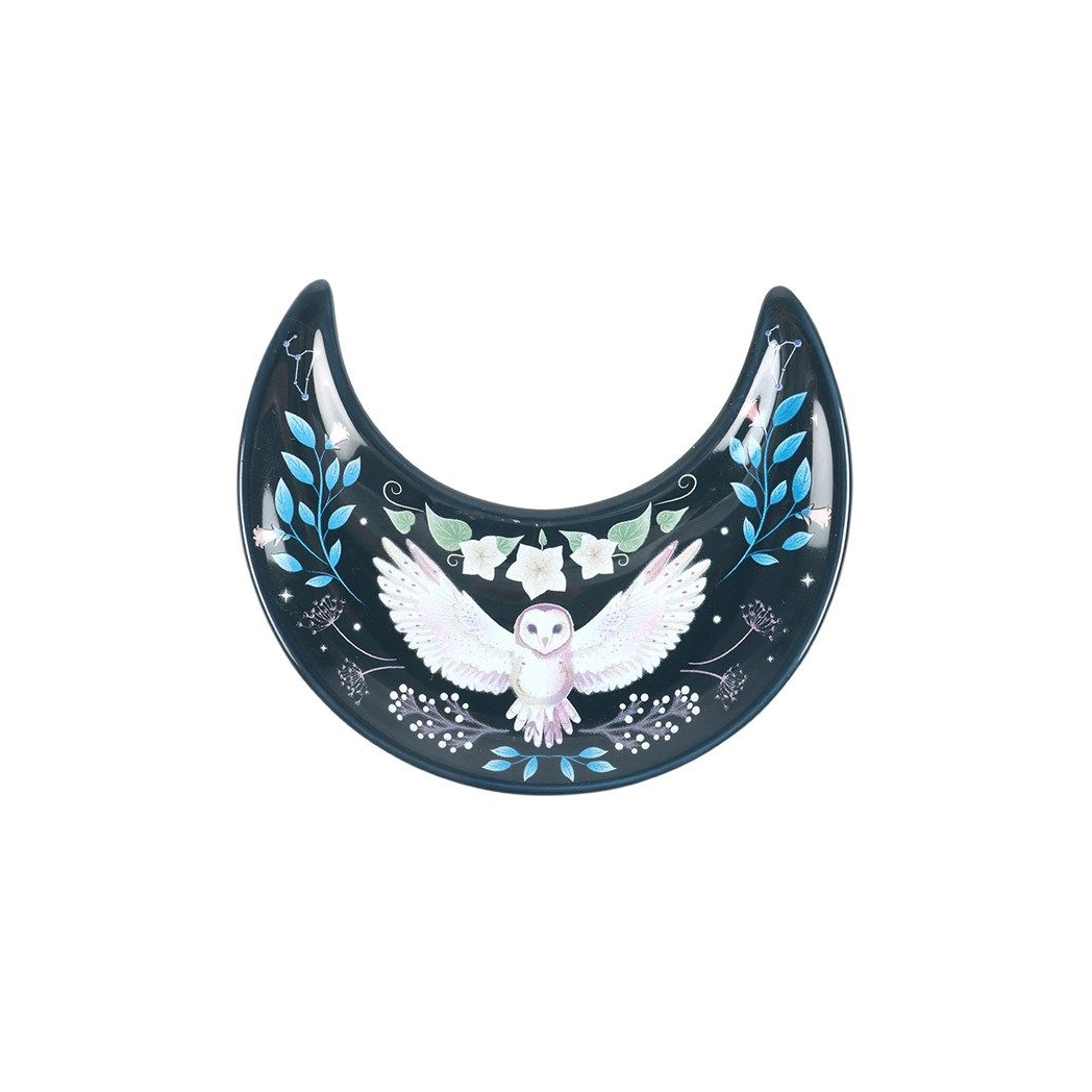 This ceramic trinket dish is shaped like a crescent moon and features a flying night owl surrounded by forest plants. Ideal for holding jewellery and other small accessories.