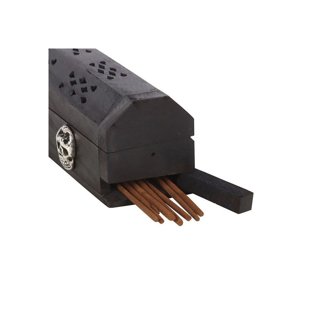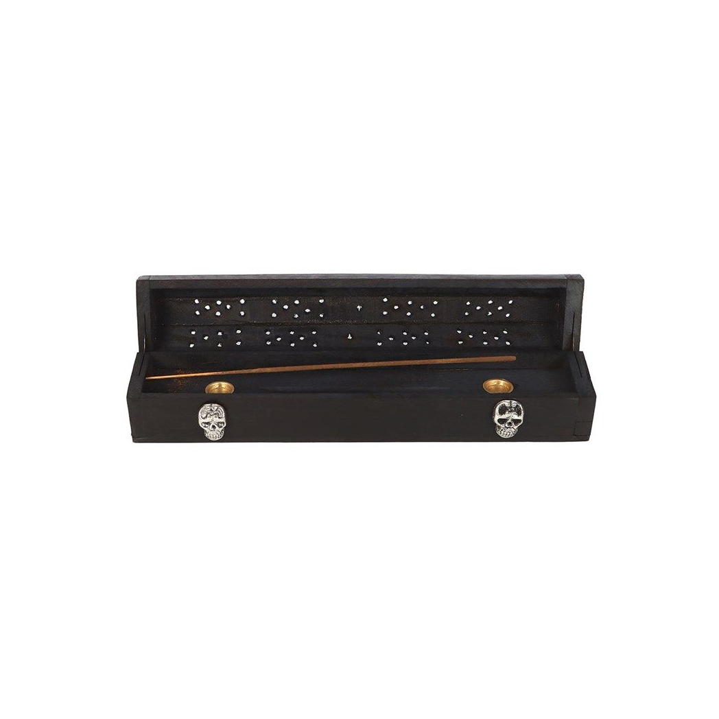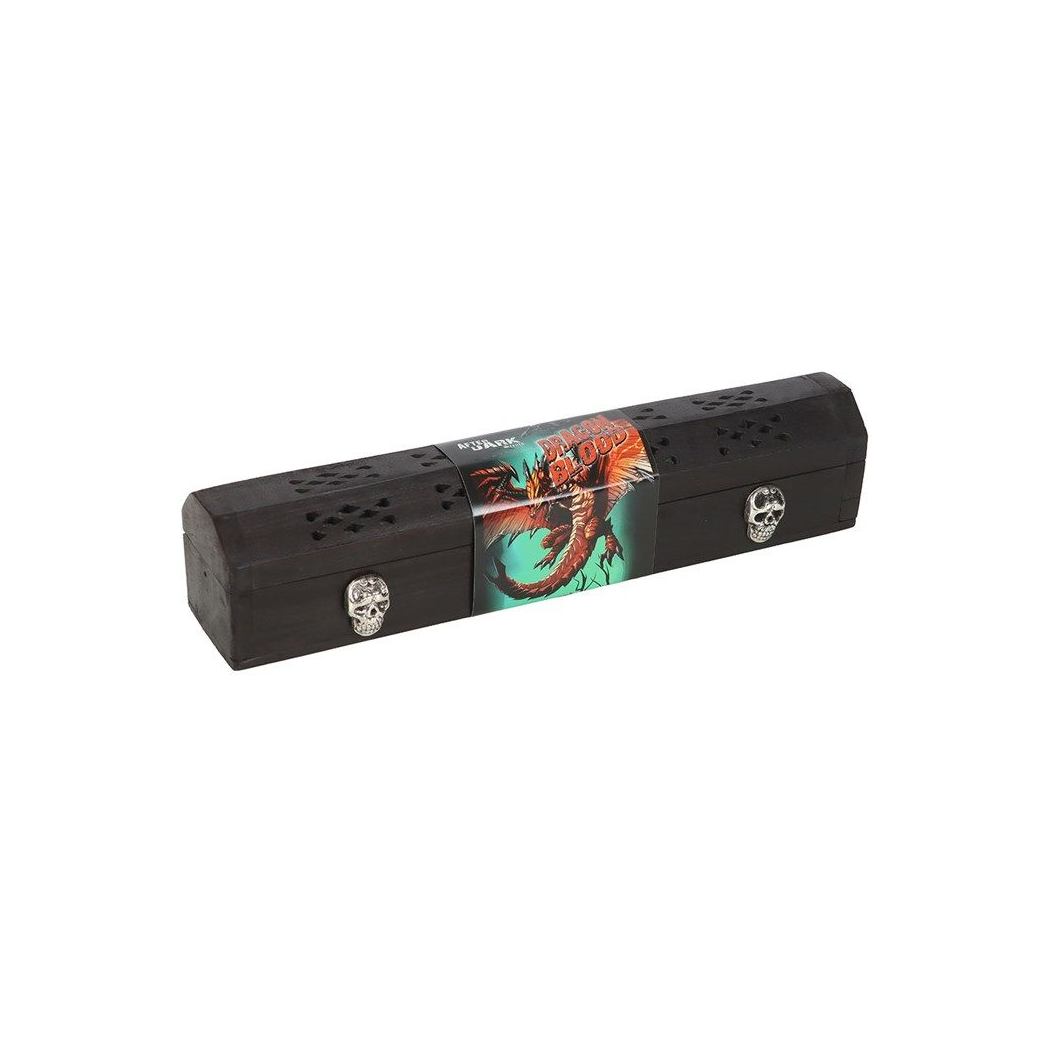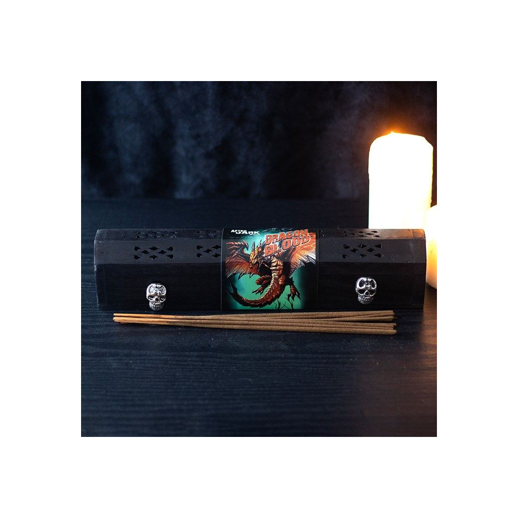 Get your blood pumping with this Dragon Blood incense box set. Includes 10 dragon's blood-scented incense sticks, providing a rich and earthy fragrance. Accented with silver skulls, the wooden box doubles as both an incense holder and storage. A perfect set for adding a touch of excitement to your favourite dark hideaway.
