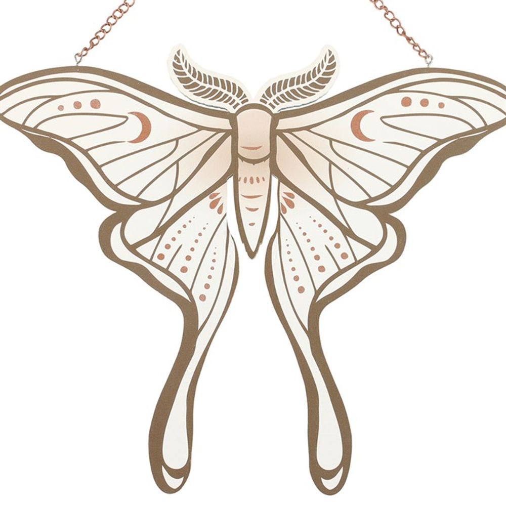 This elegant luna moth-shaped hanging sign adds whimsical charm to any room. A delicate symbol of transformation and mystery, its intricate wings represent timeless beauty. Hang in windows, on doors or across walls.