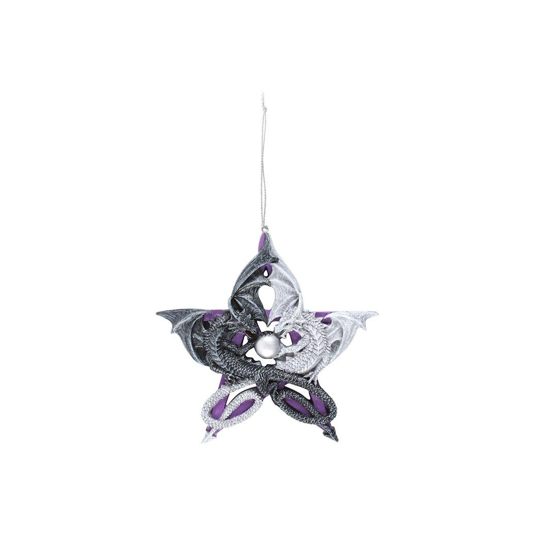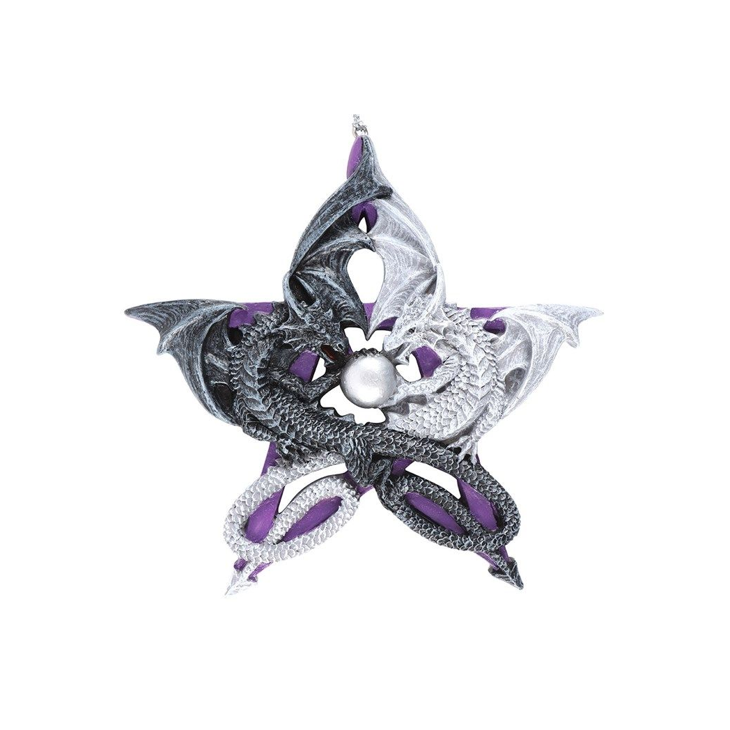 This pentagram hanging ornament features two entwined and battling dragons, making it a unique decorative accent. With a loop attached ready for hanging, it could also be displayed on the Christmas tree for an alternative festive style. Designed by fantasy artist Anne Stokes.