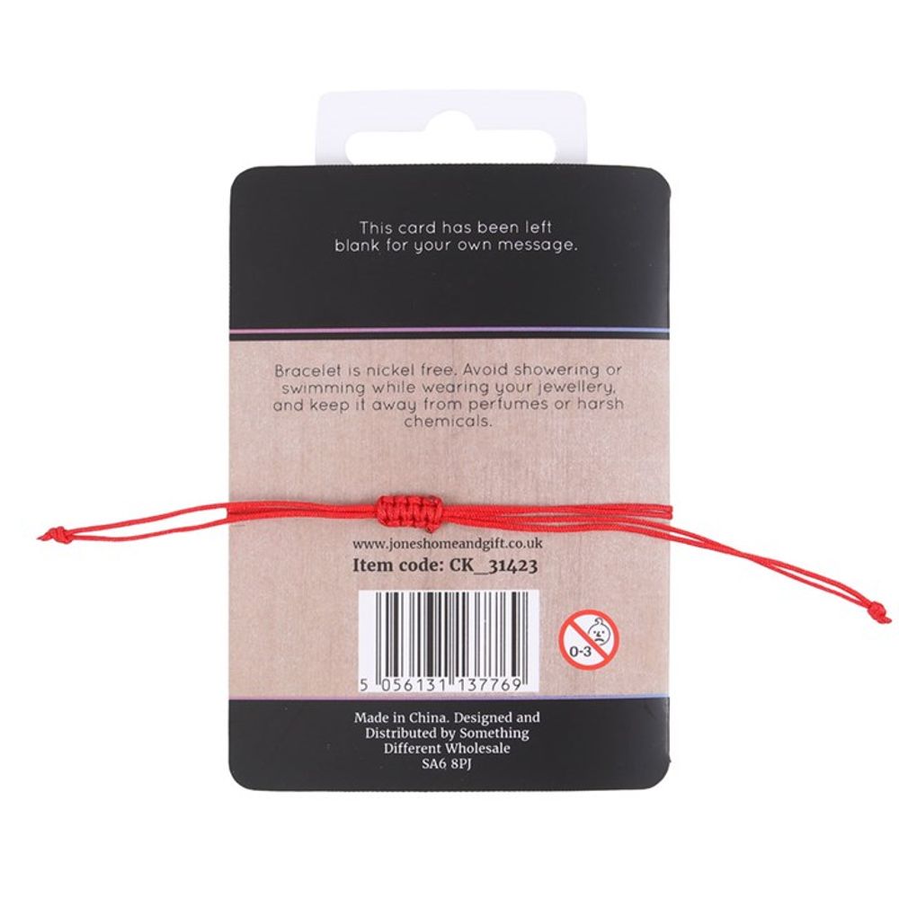 Balance and realign the root chakra with this red string and metal charm bracelet. Presented on a matching backing card that reads, 'Security, foundation, grounding, survival, stability'. Product Dimensions: H1.9cm x W2.4cm x D0.8cm Packaged Dimensions: H2.3cm x W13cm x D2cm