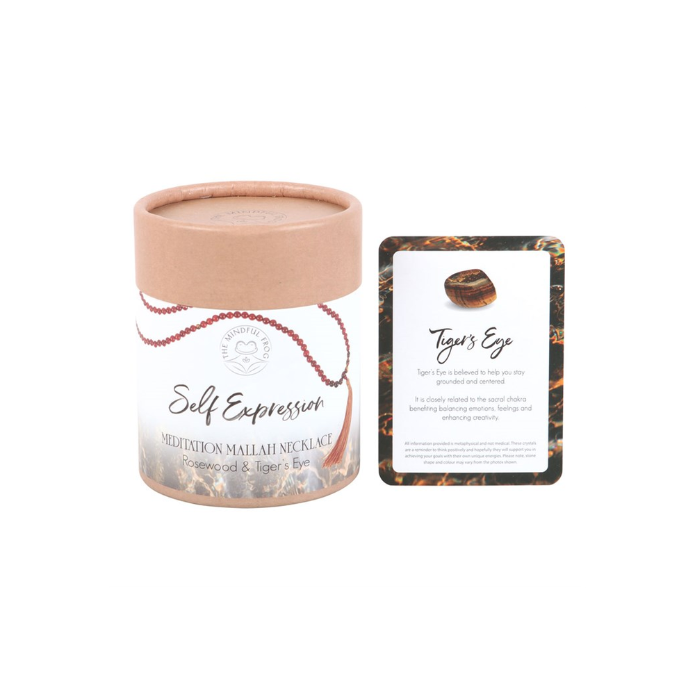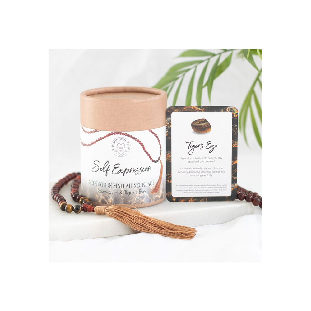 Crafted from rich, warm rosewood beads and interlaced with striking Tiger's Eye stones, this elegant necklace displays 108 beads — a traditional count in Mallah necklaces symbolizing a spiritual journey and mindfulness — and is completed with a decorative tassel. The Tiger's Eye, known for its empowering and protective qualities, is associated with the throat chakra, fostering self-expression and communication. It is believed to enhance confidence, encourage clear thinking, and empower the wearer to speak their truth with clarity and courage. A Mallah, or Mala, necklace is a string of beads traditionally used in meditation and prayer in various spiritual practices including Buddhism and Hinduism. Each bead represents a repetition of a mantra or prayer, aiding in focus and spiritual contemplation. To use simply hold the necklace in one hand and move from bead to bead whilst focusing on mindful breathing and repeating an intention. The necklace can be worn throughout the day as a reminder of these intentions. Each Mallah Necklace is presented in a beautifully designed box, accompanied by a corresponding information card, making it an ideal and thoughtful gift for a loved one who values communication, confidence, and personal growth.