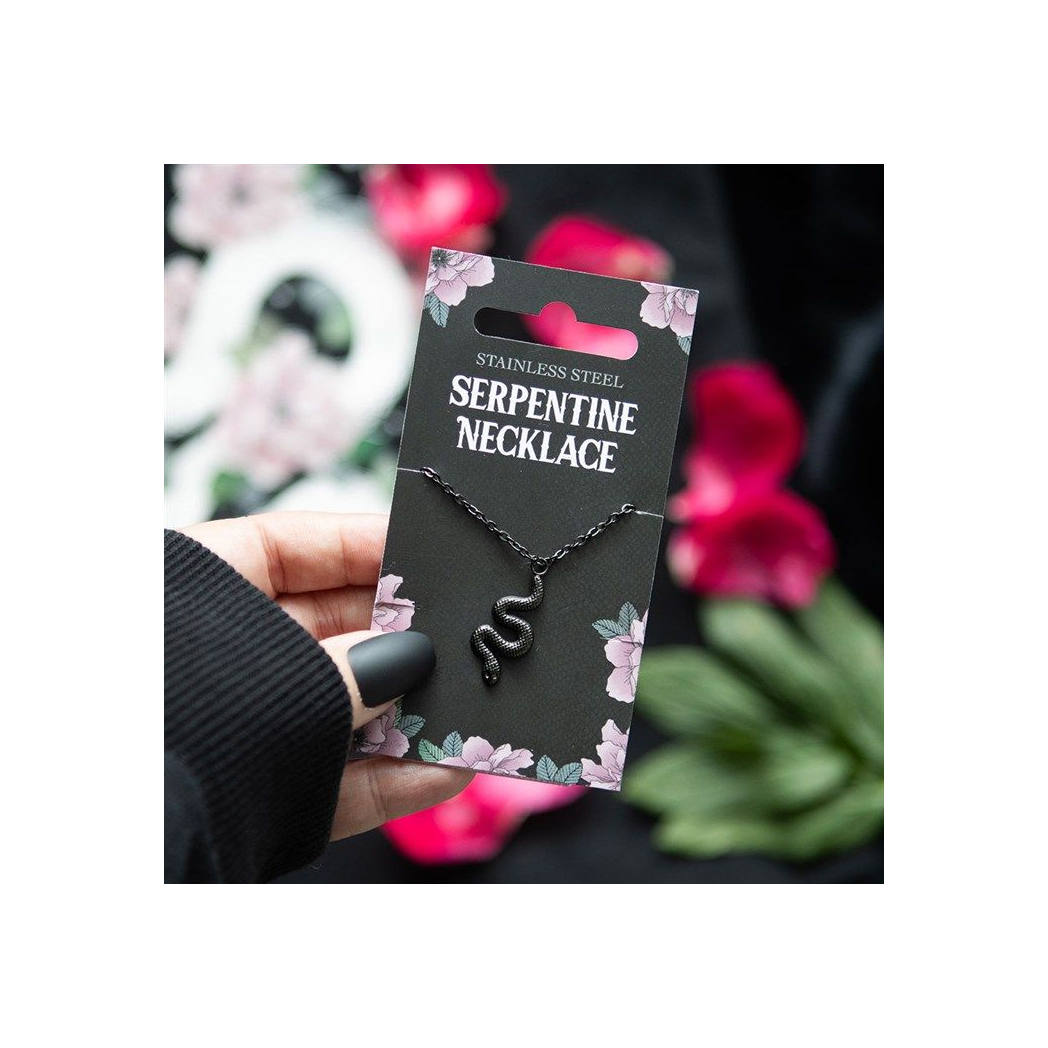 This dark and elegant necklace features a delicate snake pendant in a cool black finish. Presented on a floral backing card and perfect for gifting. Nickel-free stainless steel.