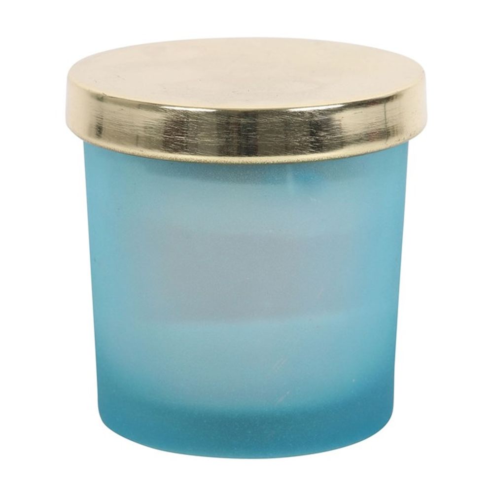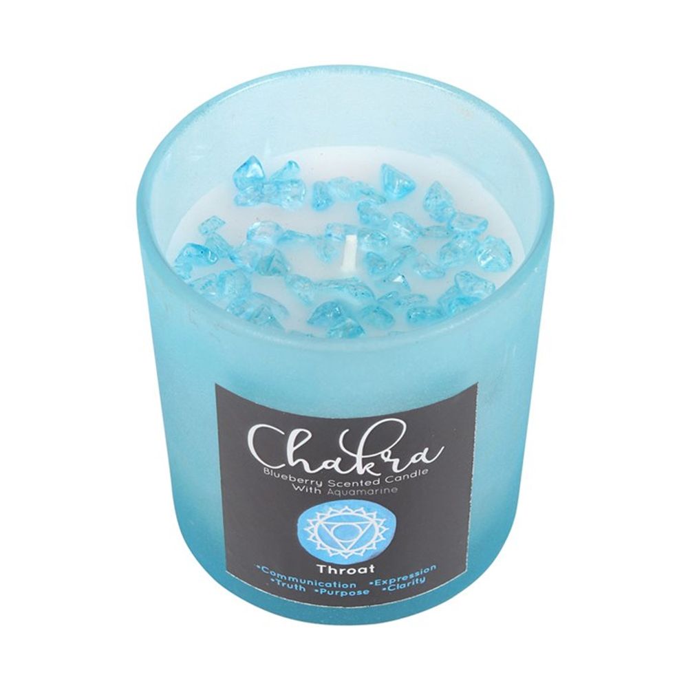 Realign the Throat chakra with this stunning Blueberry fragranced candle. A blue frosted glass holder and metallic lid are accented by a scattering of aquamarine crystal chips that can later be reused for a multitude of spiritual purposes. Paraffin wax. Approximate burn time of 25 hours. Please practice caution when burning and never leave lit candle unattended.