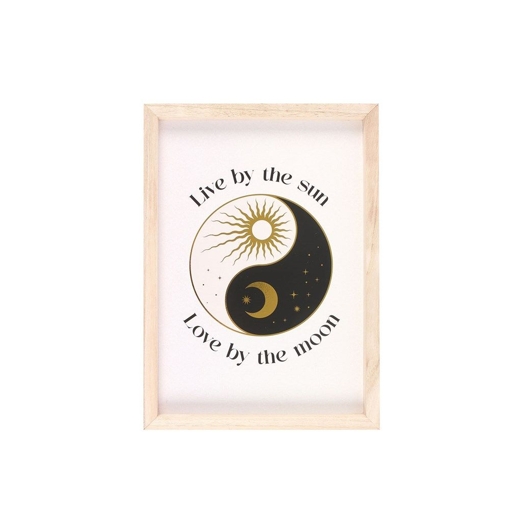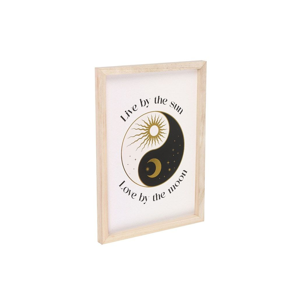 This framed print features a celestial yin and yang symbol and inspirational "Live by the sun, love by the moon" text, used to represent the harmony of opposites. Display in a bedroom, living room or office space as a gentle reminder to remain true to yourself and maintain spiritual balance. Sawtooth hanger on reverse.